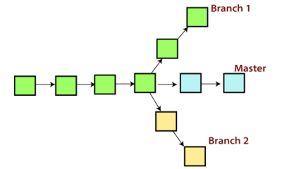 Wird ein leeres Repository geklont so gibt es initial noch keinen Branch. Mit dem ersten Commit wird der Master (jetzt Main) Branch erzeugt. Wird ein neuer Branch erstellt, so zweigt die Codebasis vom aktuellen Branch ab. Der letzte Commit des aktuellen Branches bildet somit die Basis des neuen Branches. Folgende Abbildung zeigt wie so eine Verzweigung aussehen kann: