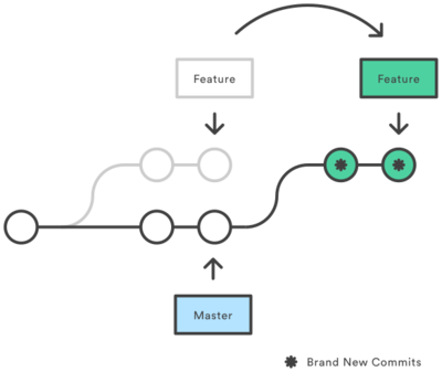 Soll nach einem Rebase erneut auf den eigenen Branch gepushed werden so ist ein git push -f, ein force push nötig, da der lokale Branch nicht mehr mit dem Branch auf dem Remote kompatibel ist. Folgendes Beispiel soll das das Rebasen vom feature Branch mit dem Master Branch wie in der Abbildung veranschaulichen: