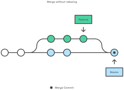 git merge ist im Gegensatz zu git rebase eine nicht inversive Methode um Branches zusammenzuführen. Die Commit History wird nicht verändert. Branches werden mit einem einzelnen Merge Commit angeglichen. Bildet ein Branch die Basis eines Anderen, so kann ein Fast Forward erfolgen, und es gibt keinen Merge Commit. Durch das verwenden von Merge erhält man eine etwas komplexere Commit History mit vielen Ausbuchtungen. Der Vorteil ist, dass alle Änderungen, die durch den Merge gemacht wurden, nachvollzogen werden können. Folgende Grafik illustriert das mergen von Änderungen des Feature Branch in den Master Branch: