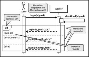 Alternativen kann man am Besten mit einer Merhfachauswahl in der Struktogrammnotation vergleichen. Sie haben mindestens zwei Zweige, wobei für jeden Zweig eine eigene Bedingung („Guard“) Formuliert werden kann. Wichtig ist, dass diese Bedingungen sich nicht überschneiden („disjunkt sind“). Bspw. „errorCount <= 3“ und „errorCount >= 3“ währe eine Verletzung dieser Forderung.