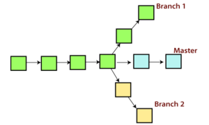 Wird ein neues Repository geklont so gibt es initial noch keinen Branch. Mit dem ersten Commit wird der Master (jetzt Main) Branch erzeugt. Wird ein neuer Branch erstellt, so zweigt die Code Basis vom aktuellen Branch ab. Der letzte Commit des aktuellen Branches bildet somit die Basis des neuen Branches. Somit ist ein Branch eine Abzweigung weg vom aktuellen Branch: Main) Branch. Folgende Abbildung zweig wie so eine Verzweigung aussehen kann:
